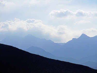 The weather forecast is for rain both today and tomorrow. The chances are high, so we are told. Let's hope so. We badly need as much rain as we can get. It felt cool again this morning, even though the sun was shining brightly. But a nice wind kept us from overheating. Becca sought shade out, nevertheless, as she is often wont to do. There were a few other outdoor enthusiasts on the mountain, including two less-than-friendly women joggers who literally ignored my "Good morning."