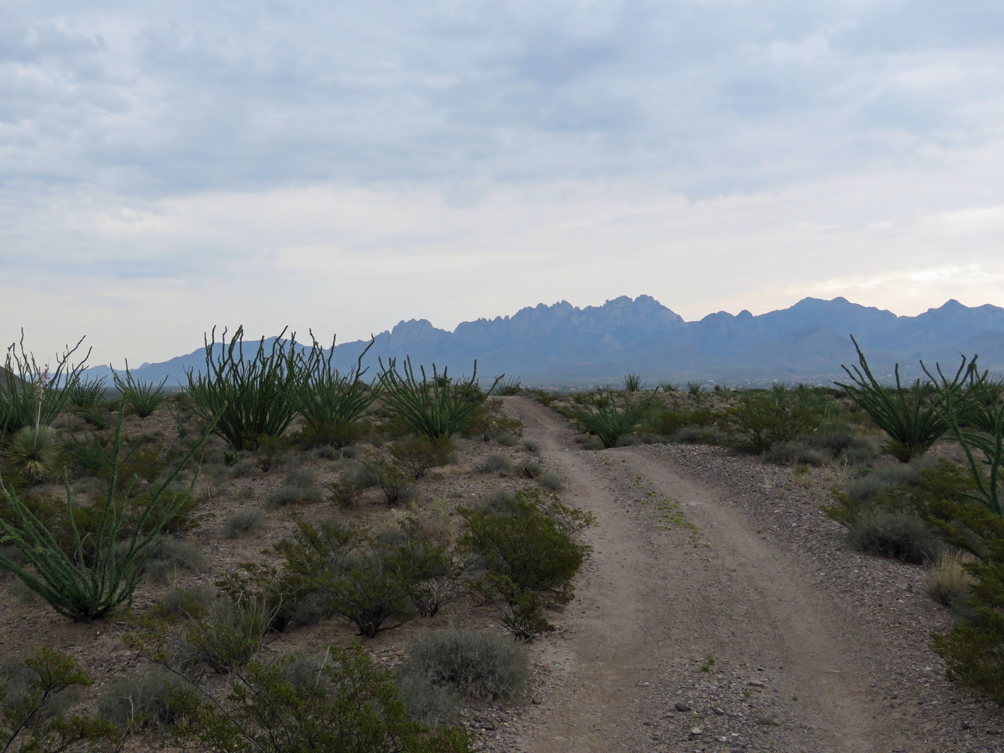 We saw a woman with a white dog running north on the long dirt road, but we never came close to catching up with her. We did have to step off the road for a passenger car that was coming up behind us fairly quickly. The guy driving waved to us as he passed at a good clip, making me wonder why anybody would want to drive a passenger car so quickly on a rugged, though sandy, dirt road.