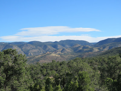 The weather was wonderful for a hike on one of our favorite high country trails. The only other hikers we encountered were two women--one elderly, one younger (her daughter, perhaps)--who were very friendly, the younger one asking if we were training the Heelers since we were giving them treats. Since the women were heading out while we were heading back we never saw them again.