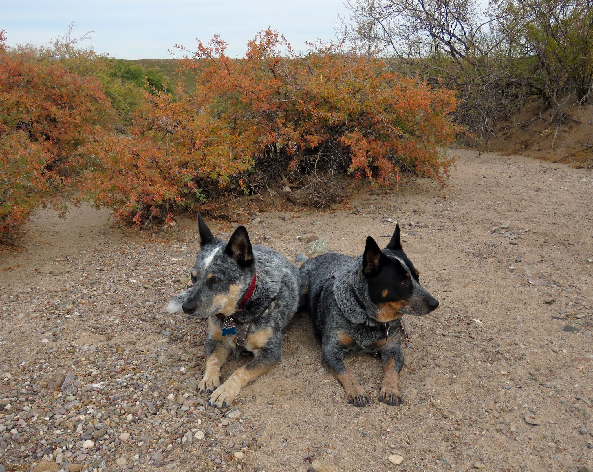 After Frio and Willow obligingly posed for portrait photos we continued on into the head of the new arroyo, climbed the steep hill out, and made our way along the upper flatland road toward our waiting CR-V.