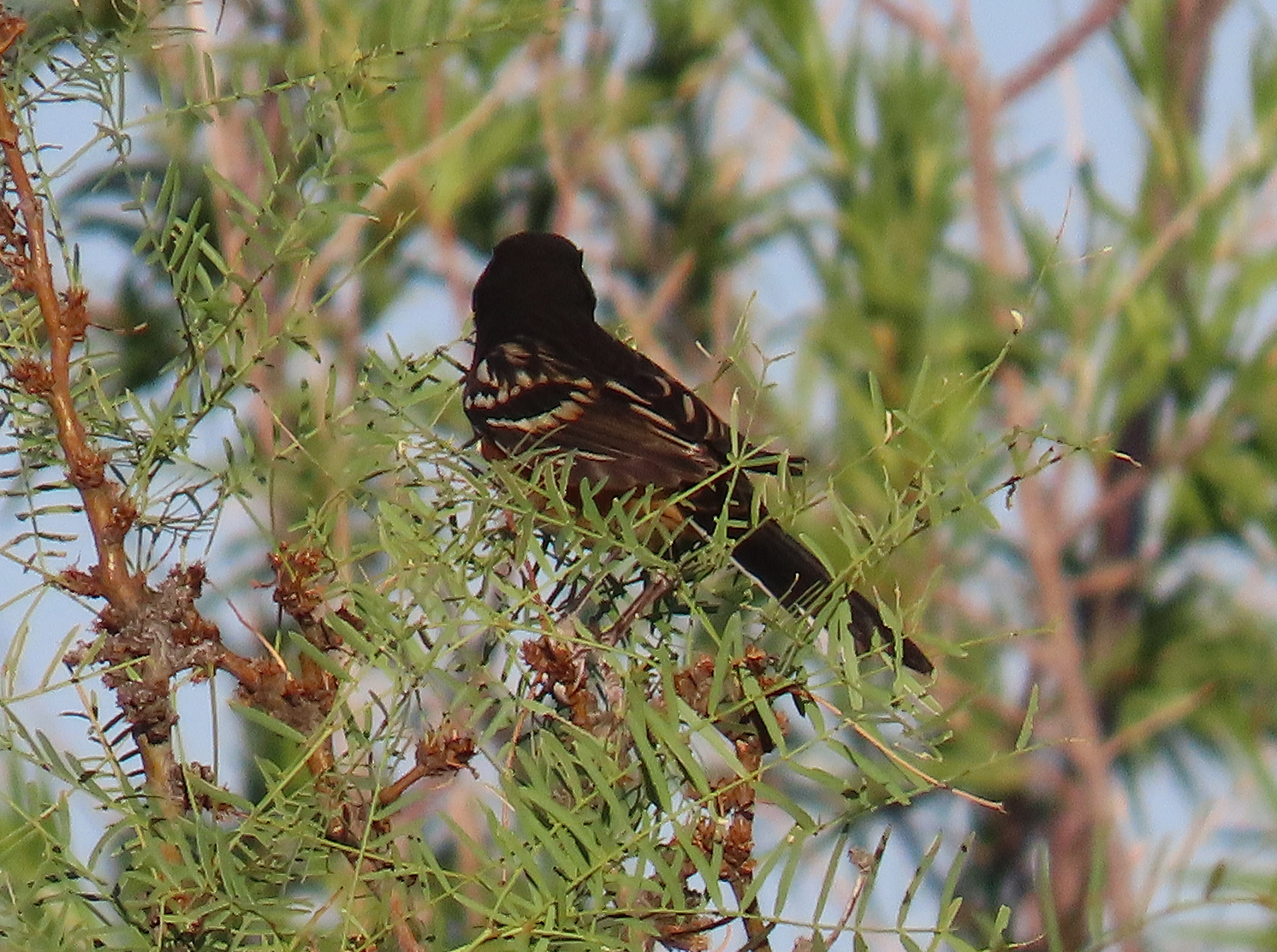 Despite many attempts I couldn't get a decent photo of the Spotted Towhee pictured here. Two things puzzled me about the bird: first, its eyes weren't red/orange like countless ones I've seen, and photographed, in higher elevations, and, second, I've never seen one down here in the lower desert. From its markings, though, it's undoubtedly a Spotted Towhee.